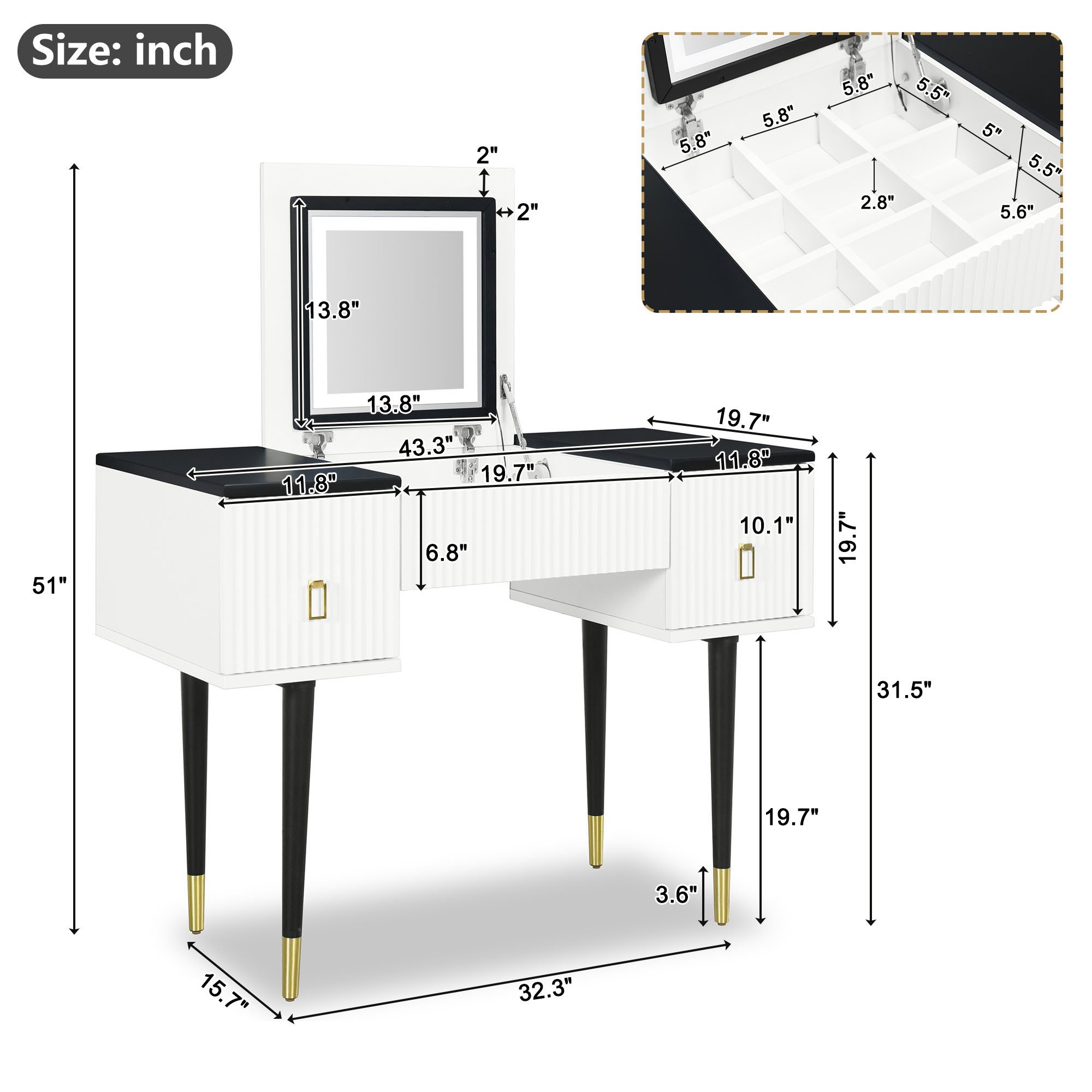 43.3" Modern Vanity Table Set with Flip-top Mirror and LED Light, Dressing Table with Customizable Storage, White and Black