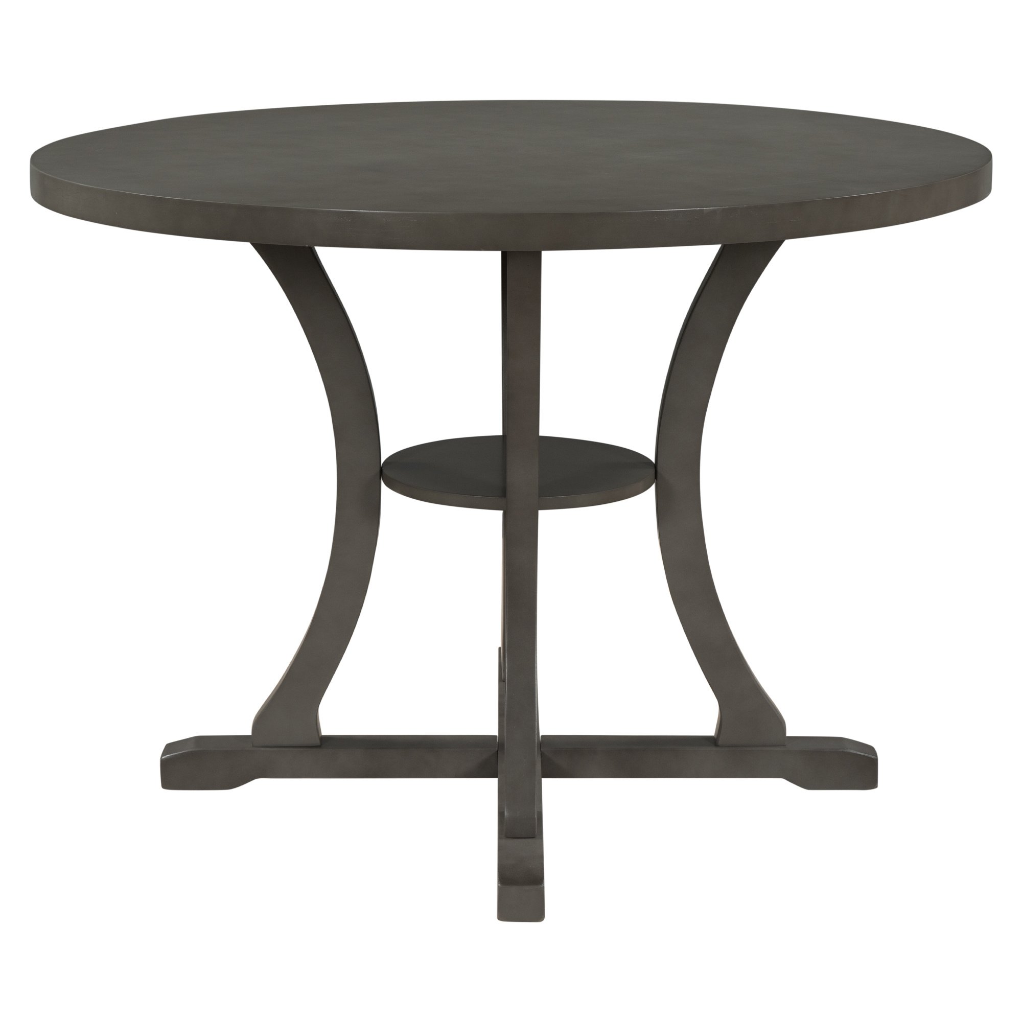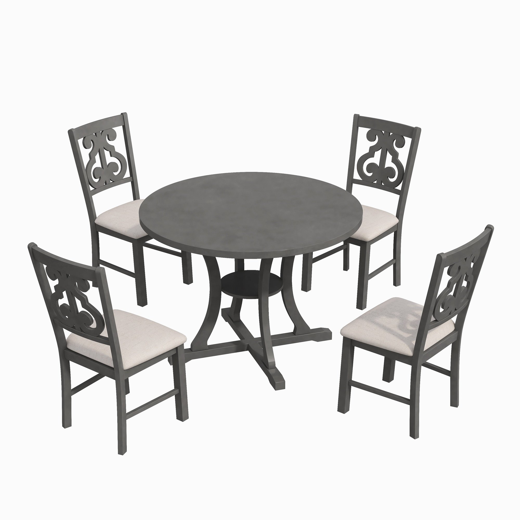 5-Piece Round Dining Table and 4 Fabric Chairs with Special-shaped Table Legs and Storage Shelf