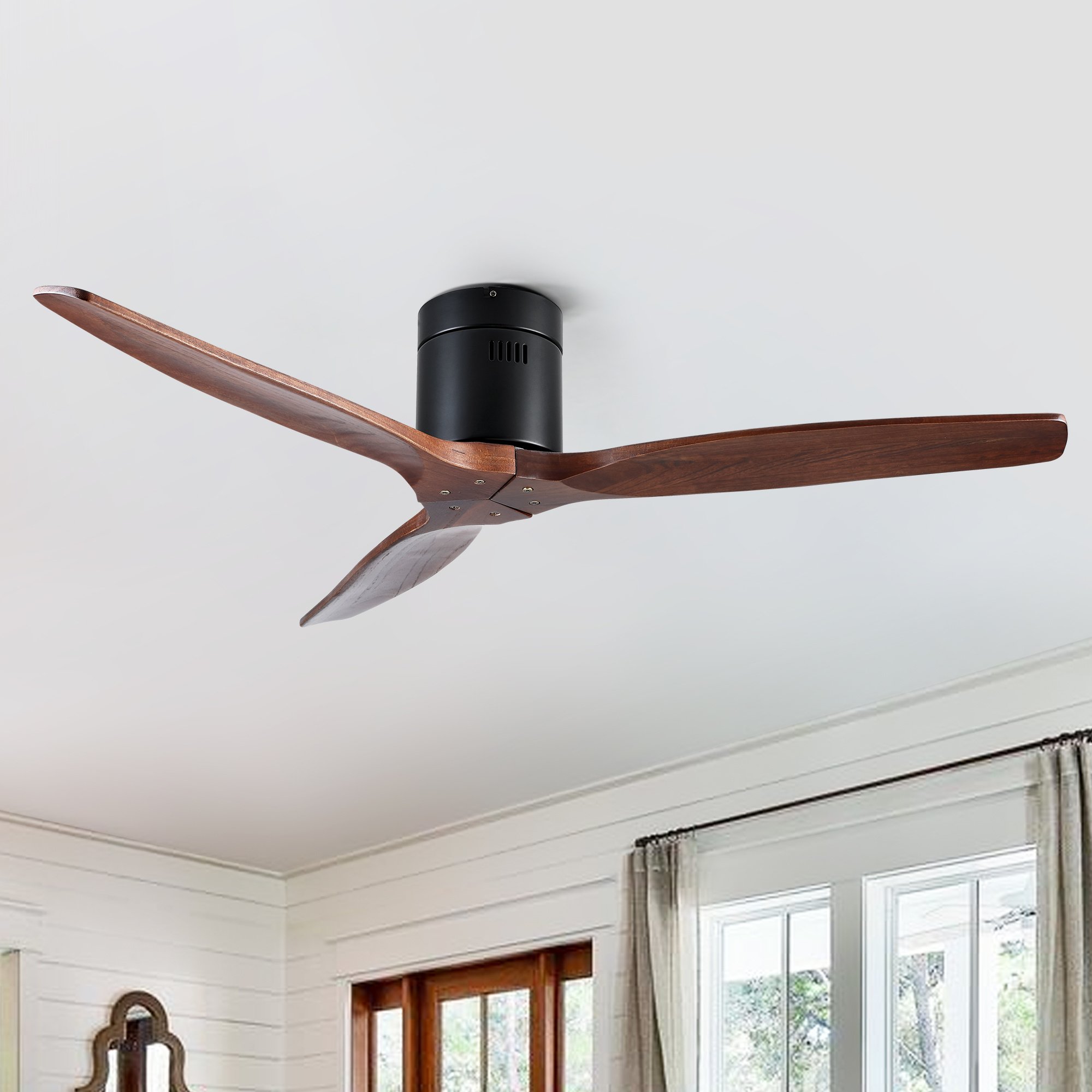 52In.Farmhouse Flush Mount Low Profile Ceiling Fan with Solid Wood Blades and Remote Control