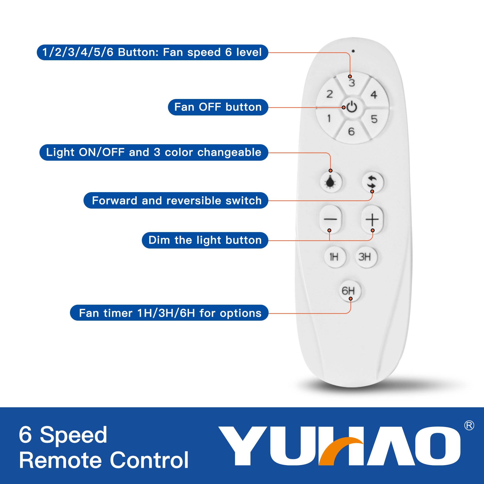 YUHAO 56-in. LED ceiling fan is suitable for any room in your home. Its finish looks like a flower and it will make your space more beautiful and design. It has a DC reversible motor, which will not only feel warm in winter and cool in summer, but will also be more energy efficient. It is controlled by remote control, powerful and more convenient to use. The timer function is very kind and can make you sleep more comfortably.Specifications: RPM:230Lumens: 2000Blade material: ABSMaximum Airflow:7000LED lampshade material: acrylicSuitable for living room, bedroom, dining room, etc.Also suitable for outdoor Spaces, but only for dry environments.