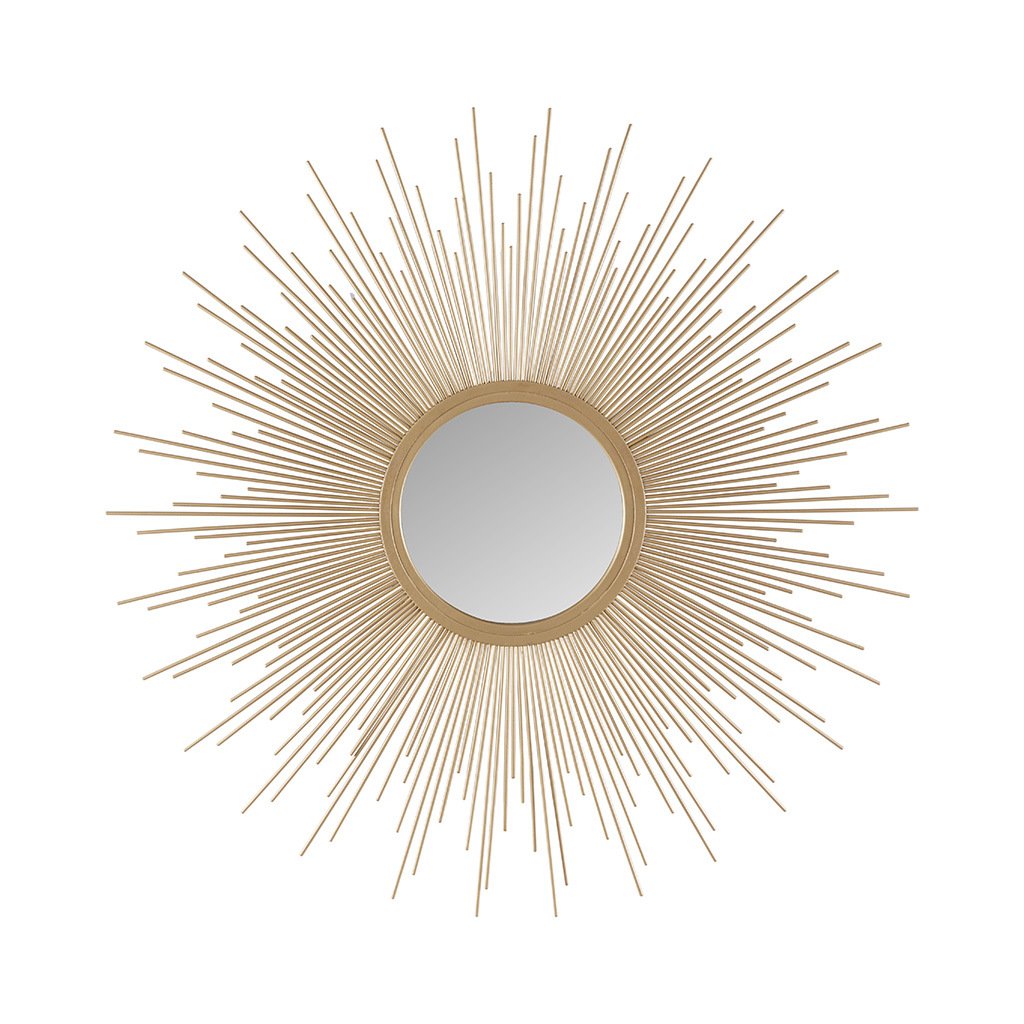 DescriptionAdd a modern and glamorous touch to your space with our Madison Park Sunburst Mirror. A stylized iron frame is featured in a sphere design creating beautiful dimension, while the gold foil adds a rich sheen and luster. The keyhole hanger feature on the reverse of the mirror allows for effortless hanging on your wall. Incorporate this wall mirror into your decor, for the perfect combination of chic luxe and metallic flair. Mirror is sold as a single piece and does not come as a set; for the complete look purchase other size for a stylized cluster or hang individually as a focus piece. The larger piece measures 29.5" with 8"D mirror size, while the smaller piece measures 14.5" with 3.875"D mirror size. Handle with care; Gently wipe clean with a damp clothProduct Details14.5" DiaOverall:14.5"Dia x 0.98"DMirror:3.875"DiaMaterialIron: 80%Mirror: 10%MDF: 10%