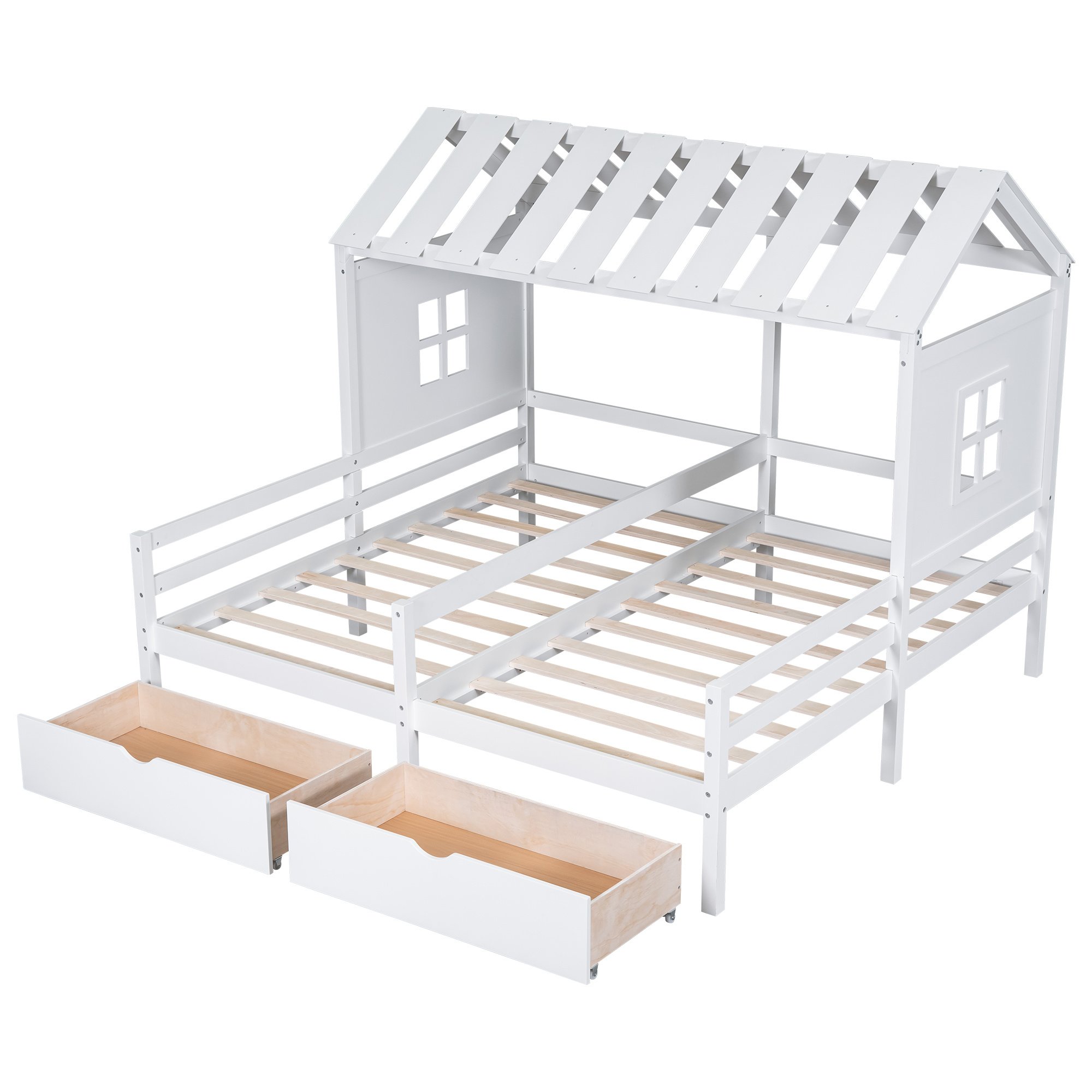 Twin Size House Platform Beds with Two Drawers for Boy and Girl Shared BedsA perfect space-saving solution for multi-child families.Crafted of pine wood and MDF, this two twin size house platform bed is sturdy and durable to withstand the test of time.A simple finish enhances the smooth lines and adds a contemporary feel to any room set aside for multiples to sleep. Ample storage space is provided by the two large drawers under the beds.[House Bed Design ] Featuring a pitched roof and wall section with window, this unique and intricately designed bunk bed creates a fun and adorable space that not only serves as a comfortable sleeping area but also double as a space for your family to play and have fun.DescriptionMaterialPine wood+MDFSizeTwin+TwinColorWhiteNumbers of Package2Spring BoxNo needAssembly RequiredYes