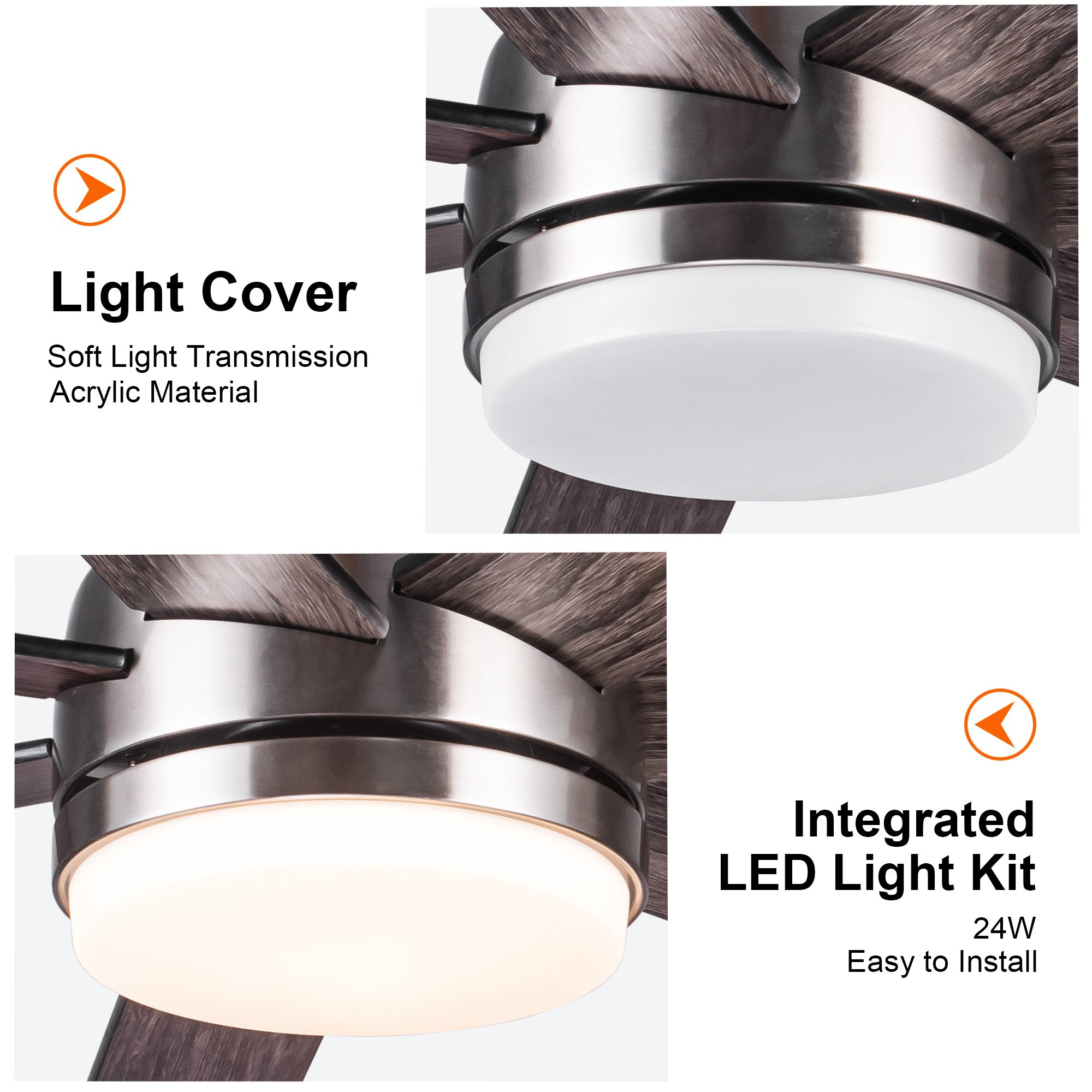 The 60 in. ceiling fan by YUHAO. This modern farmhouse style fan features a powerful DC motor and 7 reversible blades to circulate air in great room spaces and covered outdoor locations like porches and patios. The fan's brushed nickel finish is complemented with a acrylic light shade and reversible blades in plywood wood grain and silver finishes to blend with many of today's decor trends. The versatile integrated LED light is dimmable and allows you to choose between is different color temperature settings ranging from warm white (3000K) to daylight deluxe (6500K) to complement your homes lighting. Convenient operation is at your fingertips with the included remote that controls the fan's 6-speeds, lighting options and rotation direction. Last but not the least, it can be intelligently controlled via the Tuya app, which is voice compatible with Alexa/Google Assistant, so let it be the highlight of your home.