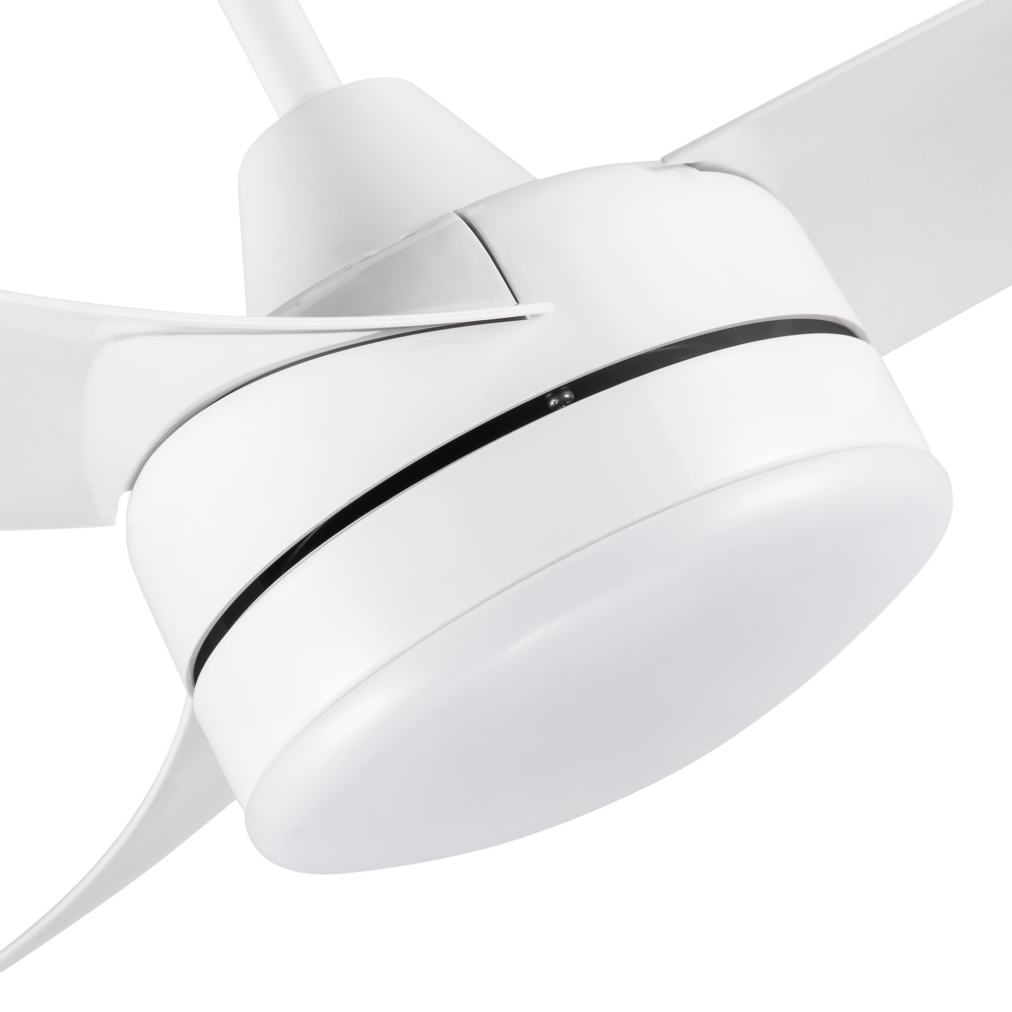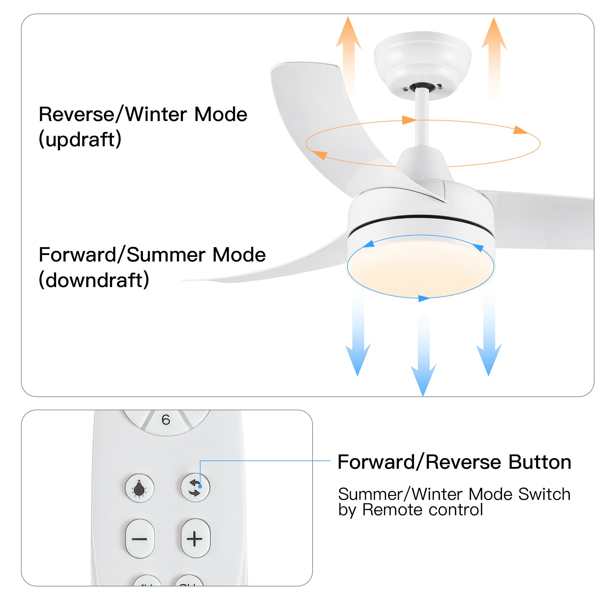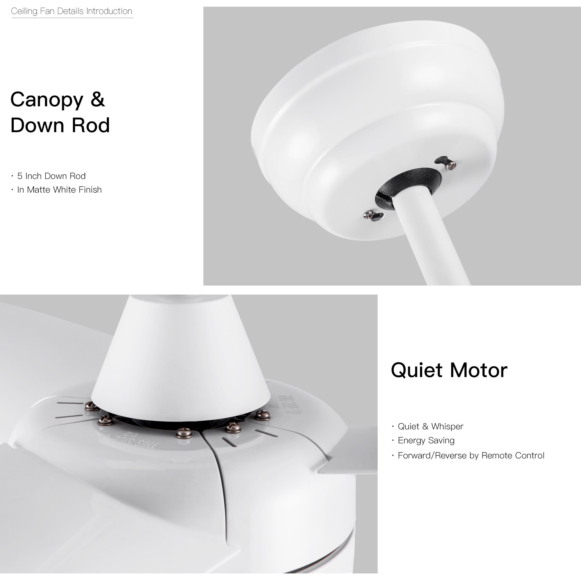 Add a touch of traditional elegance to your indoor living space with the YUHAO 42 in. ceiling fan. The white ceiling fan has a powerful 6-speed motor designed to operate quietly while producing a significant amount of airflow. The 3 Quick Install blades are finished in ABS to blend with your decor. The white acrylic light kit uses 24 Watt dimmable LED which are included in the package. With the exclusive latest DC motor technology to ensure up to 70% less energy than traditional AC motor ceiling fans. Feature-rich remote control with reversible motor speeds setting ,3 lights dimmable and fan timing function.Specifications:RPM:260Lumens: 2000Blade material:ABSMaximum Airflow:5000Product weight :10.34lbLED lampshade material: acrylic
